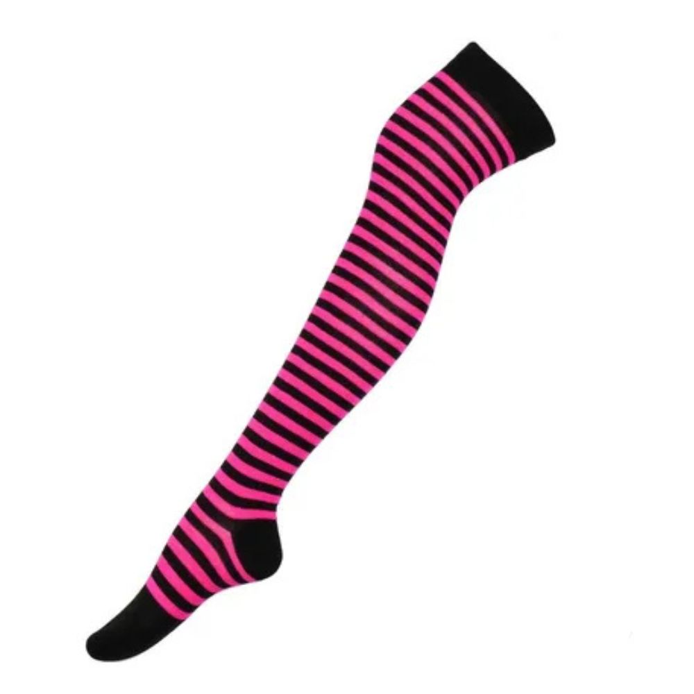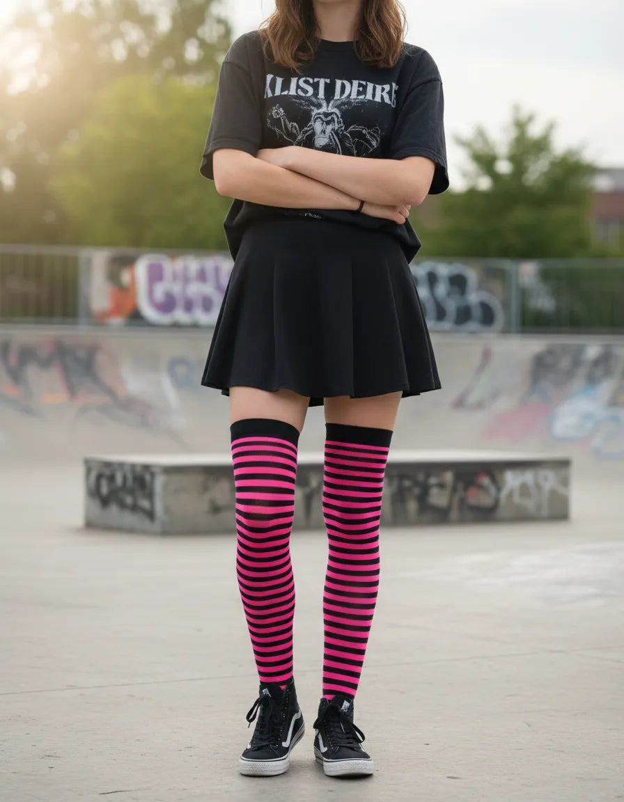 Confeccionadas en acrilán, se ajustan cómodamente hasta medio muslo, adaptándose a diferentes tipos de piernas sin apretar ni causar molestias. Además, su diseño con rayas resalta increíblemente una vez puestas, dándole un toque único a cualquier look de Halloween.
