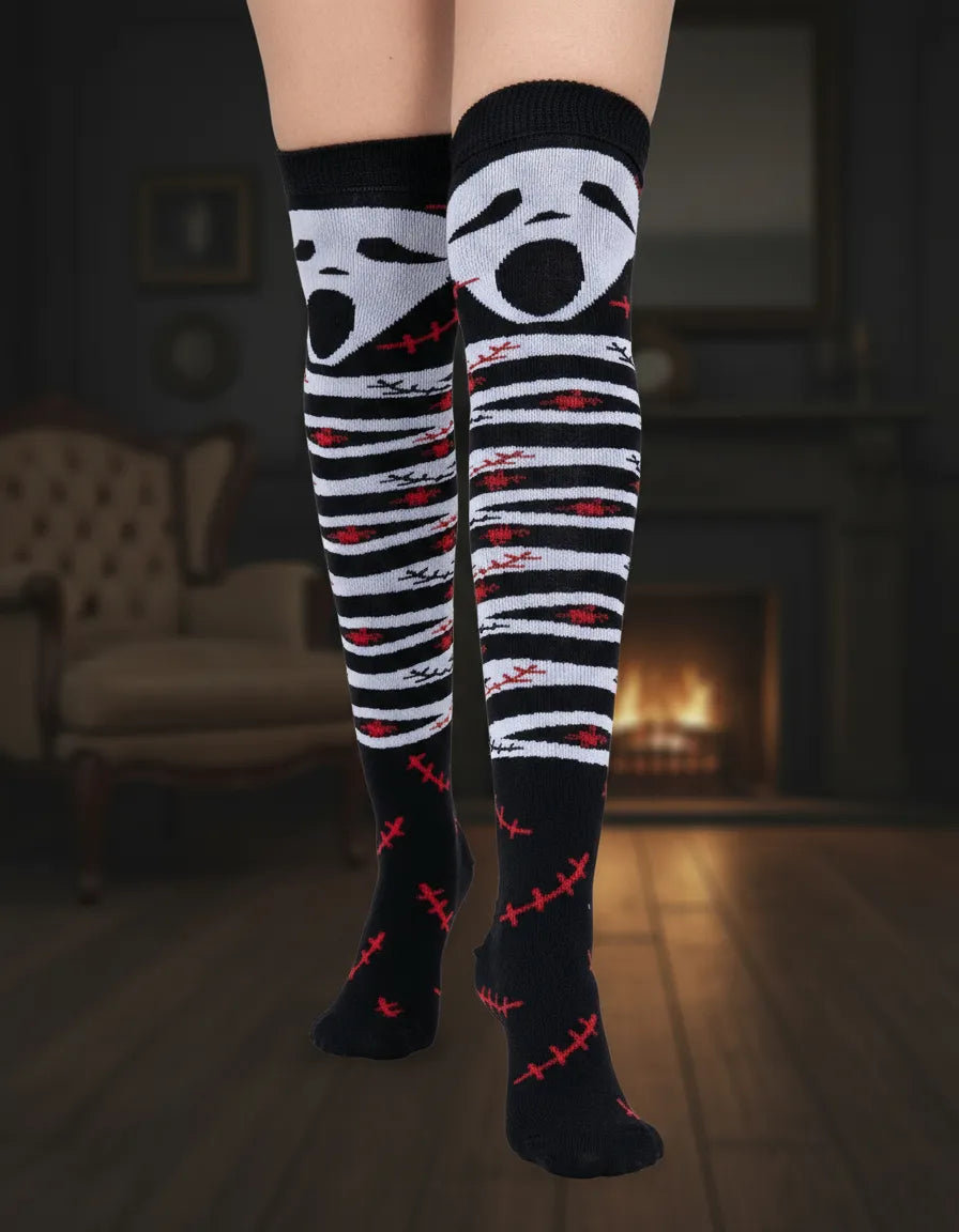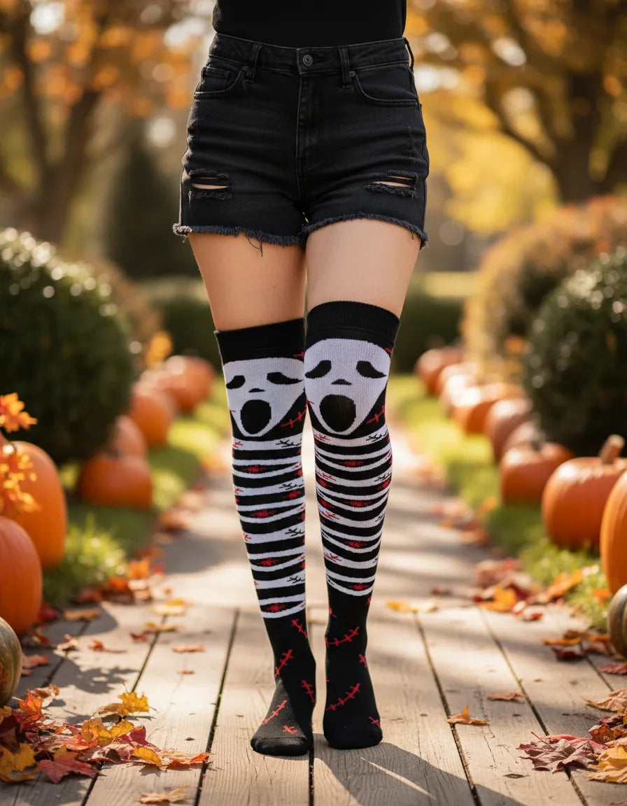 Haz que tu disfraz brille (¡o asuste!) con nuestras Calcetas Largas Halloween, ideales para mujer. Disponibles en este diseño de scream terroríficamente divertido, estas medietas son el complemento perfecto para tu disfraz.